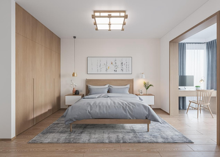 主卧采用大量的原木铺设进空间,利用承重墙隔断出电脑房空间,放置书桌椅,成为屋主加班的最佳去处。整体风格与主题呼应,延续简洁基调,尽情释放最简单纯粹的美好。