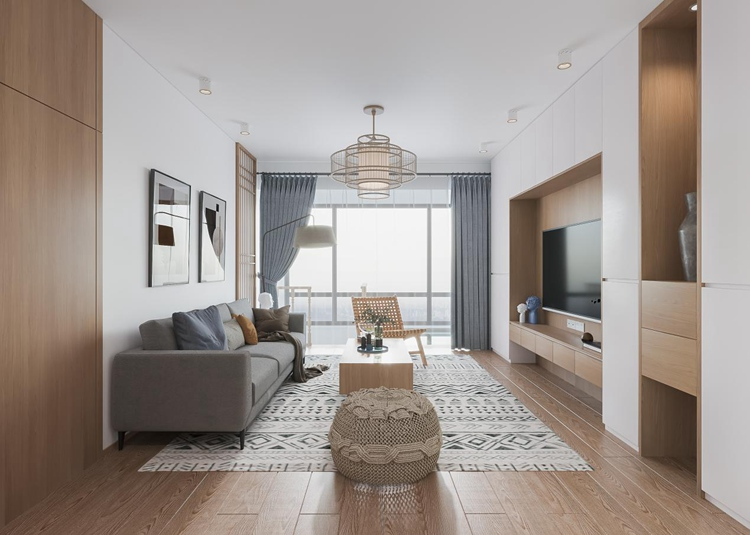 客厅电视背景的2:8的整体电视柜让居住收纳得到完美体现, 通过不同层次的木色搭配鸦青与灰色的沙发,小小的一撮绿植增添生机。