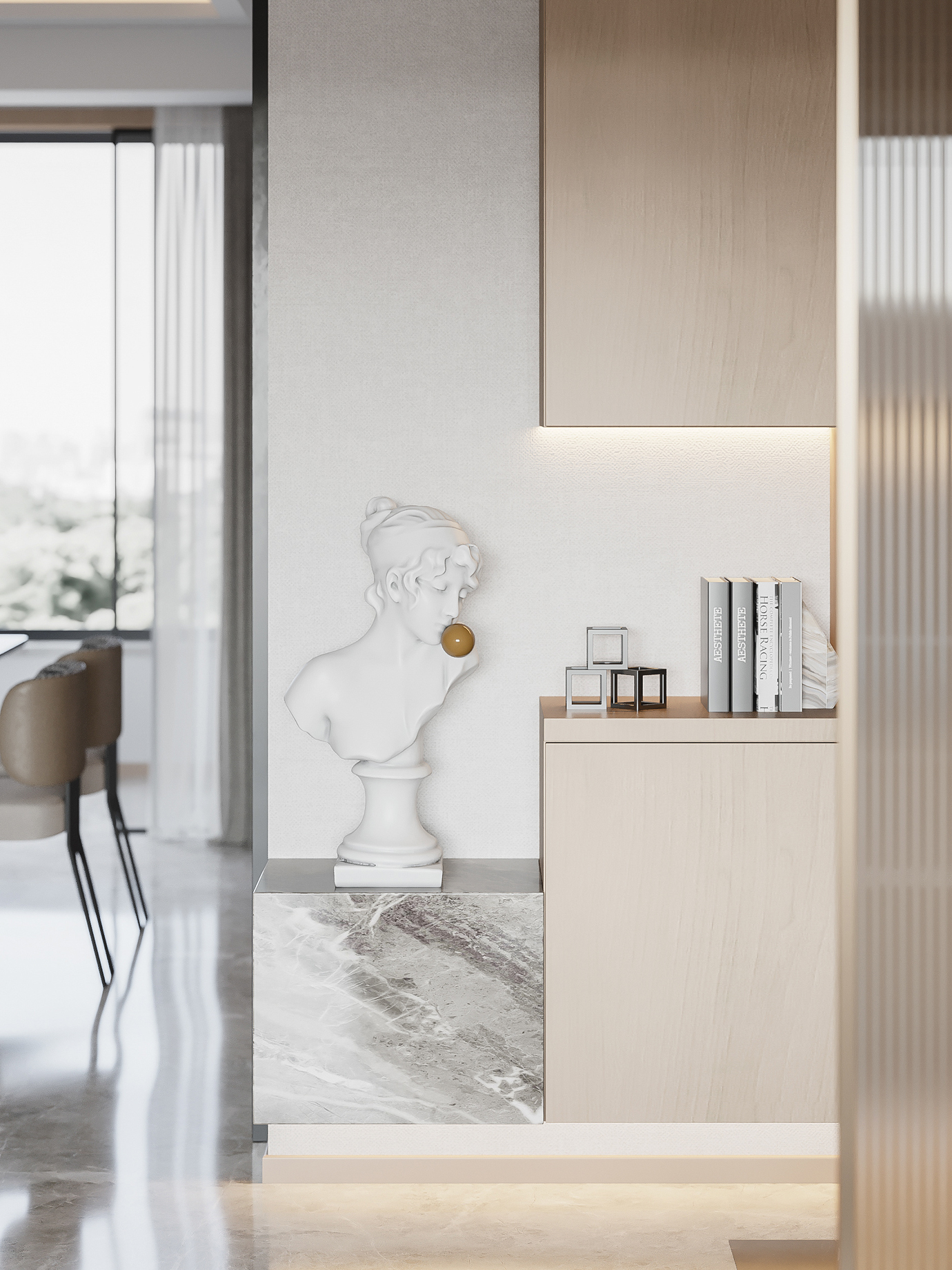 温润木色搭配白色墙体贯穿整个装修设计,入户玄关傍晚黄昏一开门那一抹温柔瞬间吹散了整天的工作疲劳,今日份的幸福感在心头环绕,慵懒却又轻快。原主卧房门的改动增加玄关区域的仪式感,餐厅区域的采光及舒适度都有了很大的提升。邻近天地壮阔,厚载心境盛境,格局是横亘于人群中幽静的分野。客厅电视背景的2:8的整体电视柜让居住收纳得到完美体现, 通过不同层次的木色搭配鸦青与灰色的沙发,小小的一撮绿植增添生机。整套空...