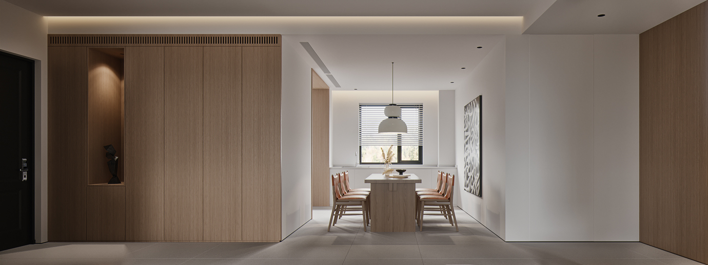 温润木色搭配白色墙体贯穿整个装修设计,入户玄关傍晚黄昏一开门那一抹温柔瞬间吹散了整天的工作疲劳,今日份的幸福感在心头环绕,慵懒却又轻快。原主卧房门的改动增加玄关区域的仪式感,餐厅区域的采光及舒适度都有了很大的提升。邻近天地壮阔,厚载心境盛境,格局是横亘于人群中幽静的分野。客厅电视背景的2:8的整体电视柜让居住收纳得到完美体现, 通过不同层次的木色搭配鸦青与灰色的沙发,小小的一撮绿植增添生机。整套空...