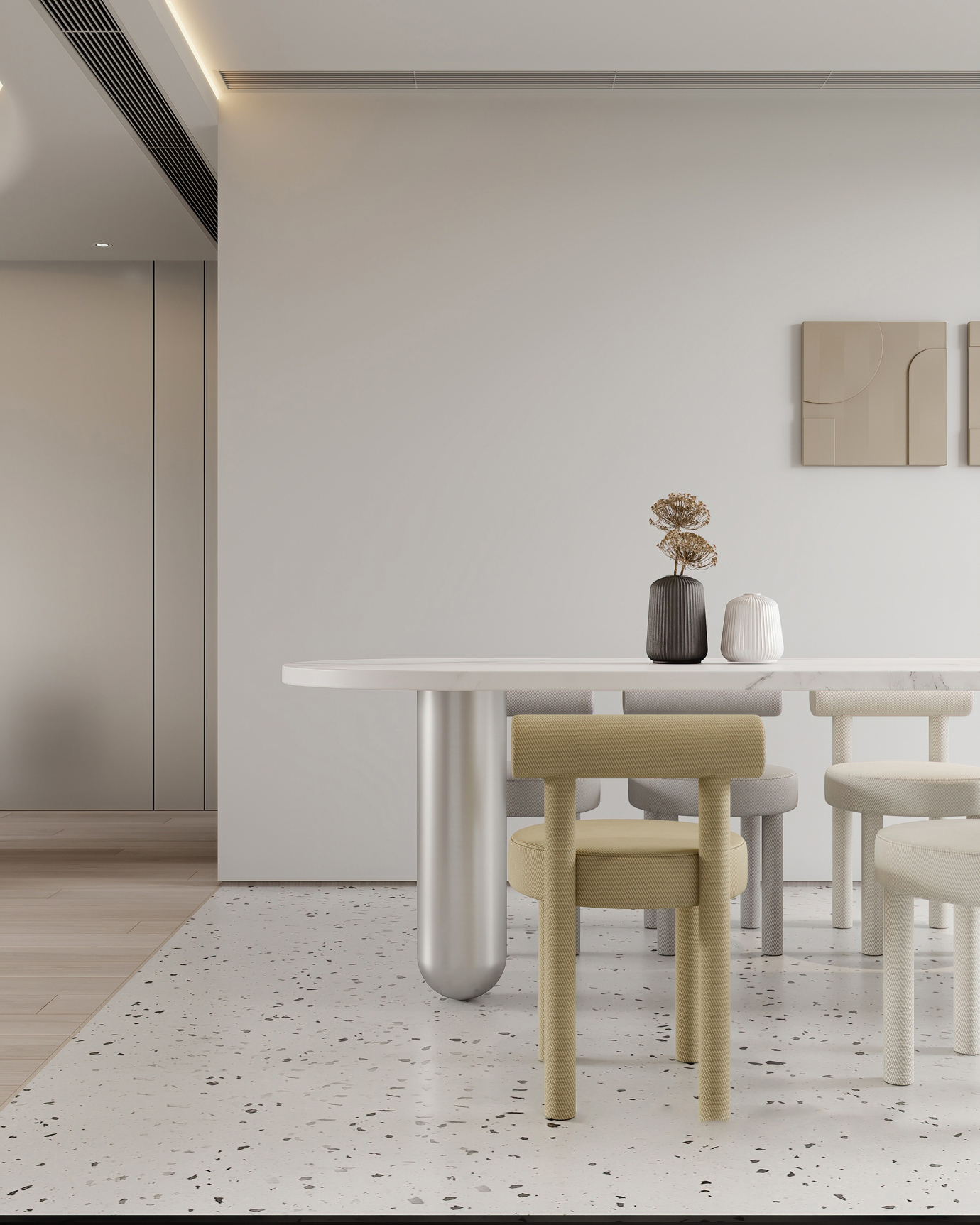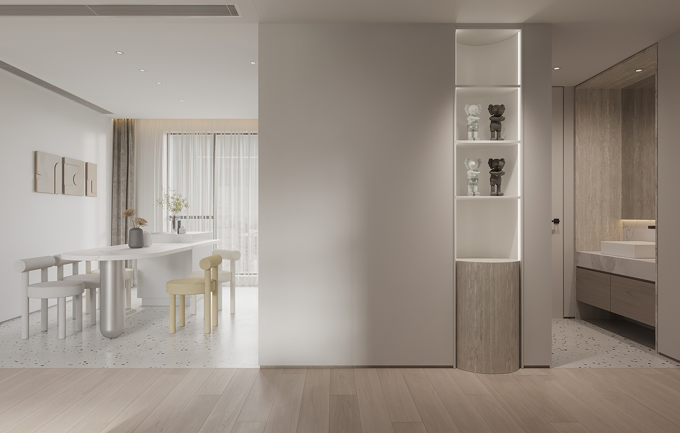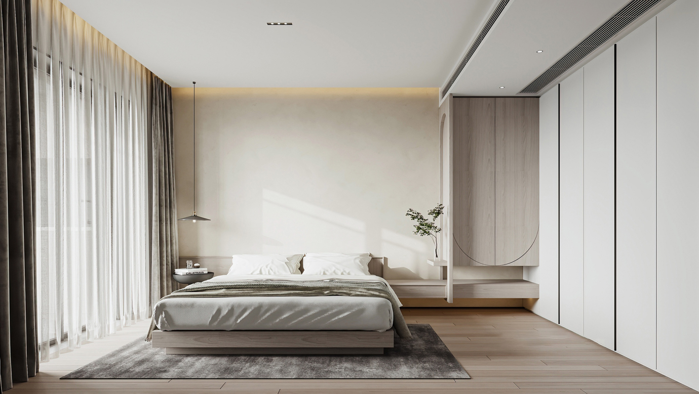 温润木色搭配白色墙体贯穿整个装修设计,入户玄关傍晚黄昏一开门那一抹温柔瞬间吹散了整天的工作疲劳,今日份的幸福感在心头环绕,慵懒却又轻快。原主卧房门的改动增加玄关区域的仪式感,餐厅区域的采光及舒适度都有了很大的提升。邻近天地壮阔,厚载心境盛境,格局是横亘于人群中幽静的分野。客厅电视背景的2:8的整体电视柜让居住收纳得到完美体现, 通过不同层次的木色搭配鸦青与灰色的沙发,小小的一撮绿植增添生机。整套空...