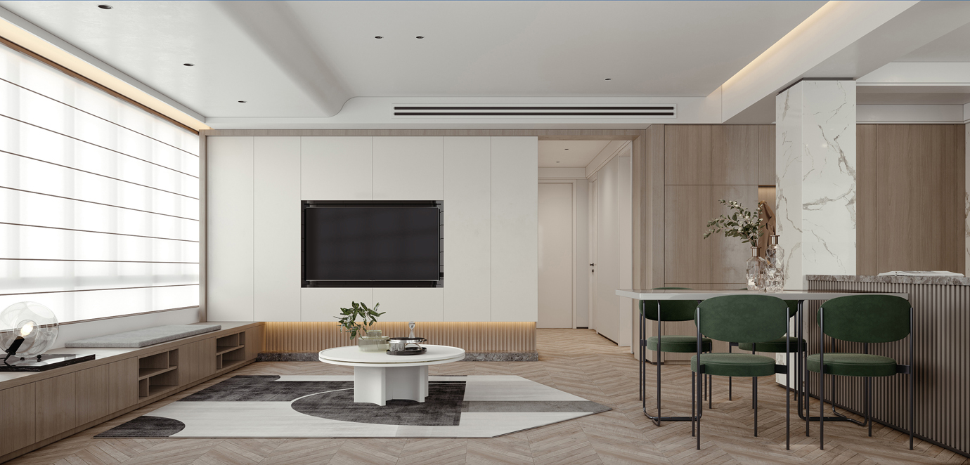 温润木色搭配白色墙体贯穿整个装修设计,入户玄关傍晚黄昏一开门那一抹温柔瞬间吹散了整天的工作疲劳,今日份的幸福感在心头环绕,慵懒却又轻快。原主卧房门的改动增加玄关区域的仪式感,餐厅区域的采光及舒适度都有了很大的提升。邻近天地壮阔,厚载心境盛境,格局是横亘于人群中幽静的分野。客厅电视背景的2:8的整体电视柜让居住收纳得到完美体现, 通过不同层次的木色搭配鸦青与灰色的沙发,小小的一撮绿植增添生机。整套空...