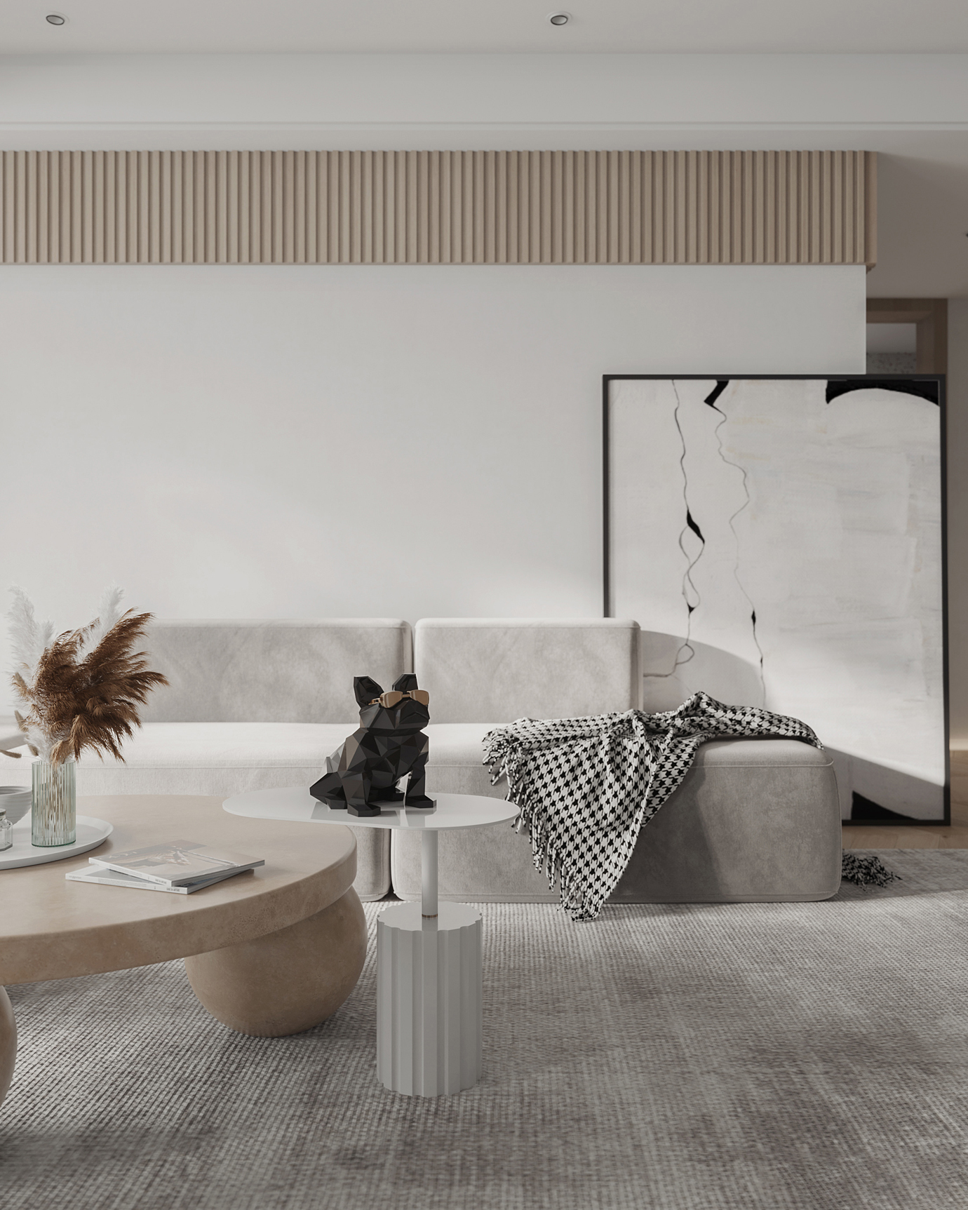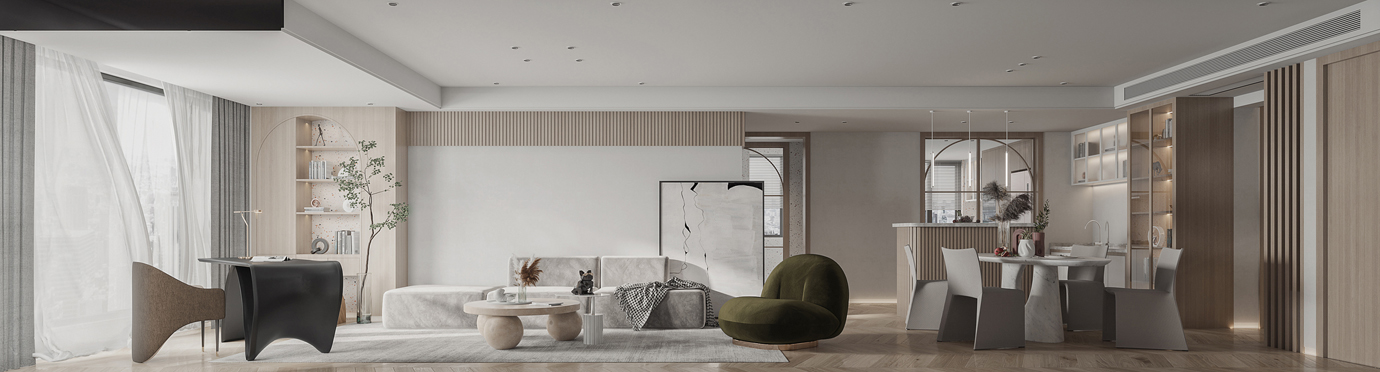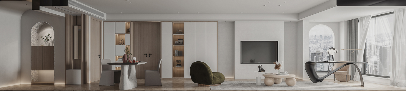 温润木色搭配白色墙体贯穿整个装修设计,入户玄关傍晚黄昏一开门那一抹温柔瞬间吹散了整天的工作疲劳,今日份的幸福感在心头环绕,慵懒却又轻快。原主卧房门的改动增加玄关区域的仪式感,餐厅区域的采光及舒适度都有了很大的提升。邻近天地壮阔,厚载心境盛境,格局是横亘于人群中幽静的分野。客厅电视背景的2:8的整体电视柜让居住收纳得到完美体现, 通过不同层次的木色搭配鸦青与灰色的沙发,小小的一撮绿植增添生机。整套空...