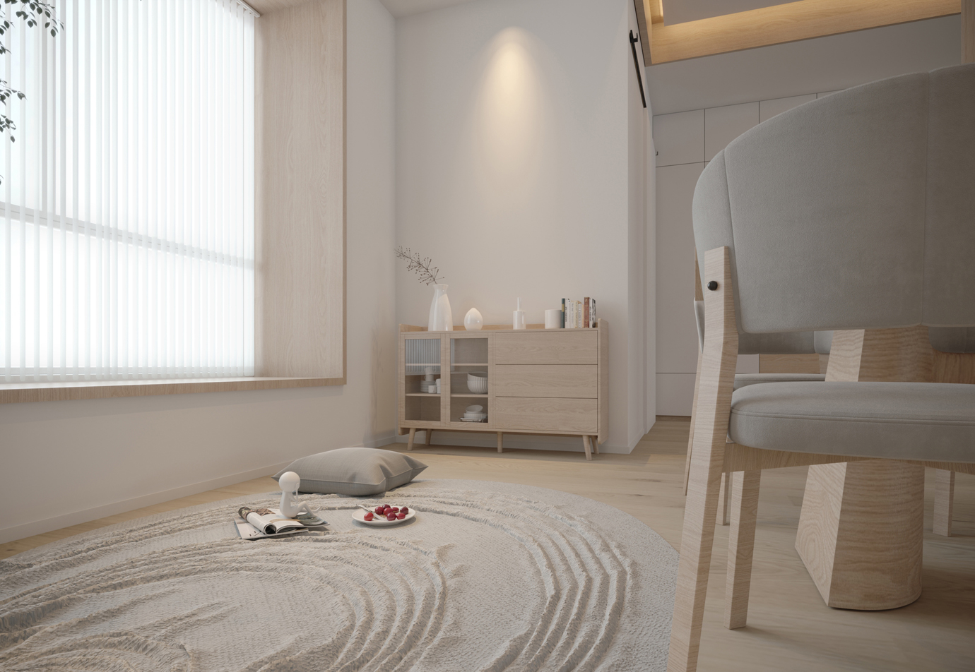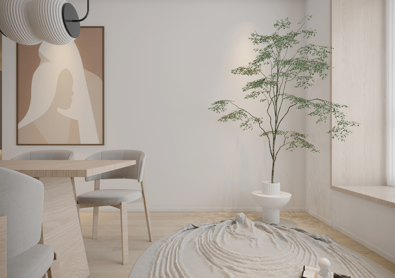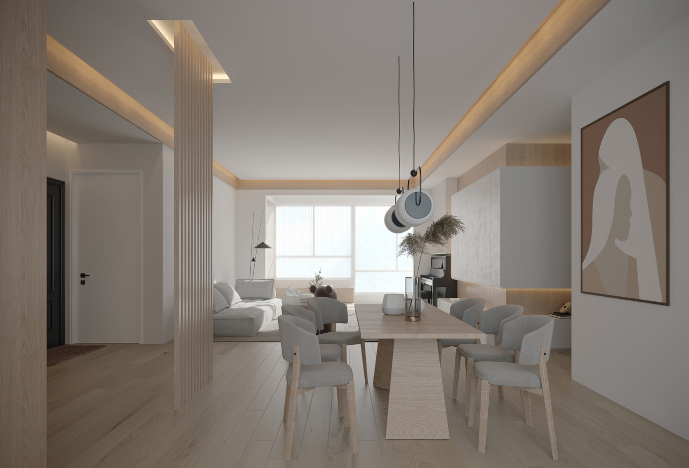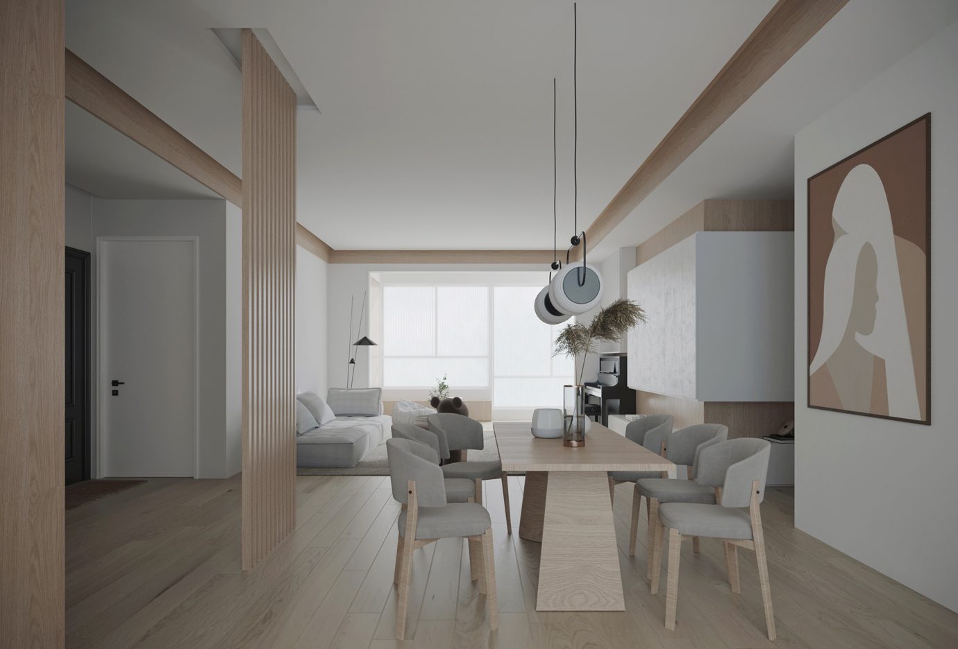 温润木色搭配白色墙体贯穿整个装修设计,入户玄关傍晚黄昏一开门那一抹温柔瞬间吹散了整天的工作疲劳,今日份的幸福感在心头环绕,慵懒却又轻快。原主卧房门的改动增加玄关区域的仪式感,餐厅区域的采光及舒适度都有了很大的提升。邻近天地壮阔,厚载心境盛境,格局是横亘于人群中幽静的分野。客厅电视背景的2:8的整体电视柜让居住收纳得到完美体现, 通过不同层次的木色搭配鸦青与灰色的沙发,小小的一撮绿植增添生机。整套空...