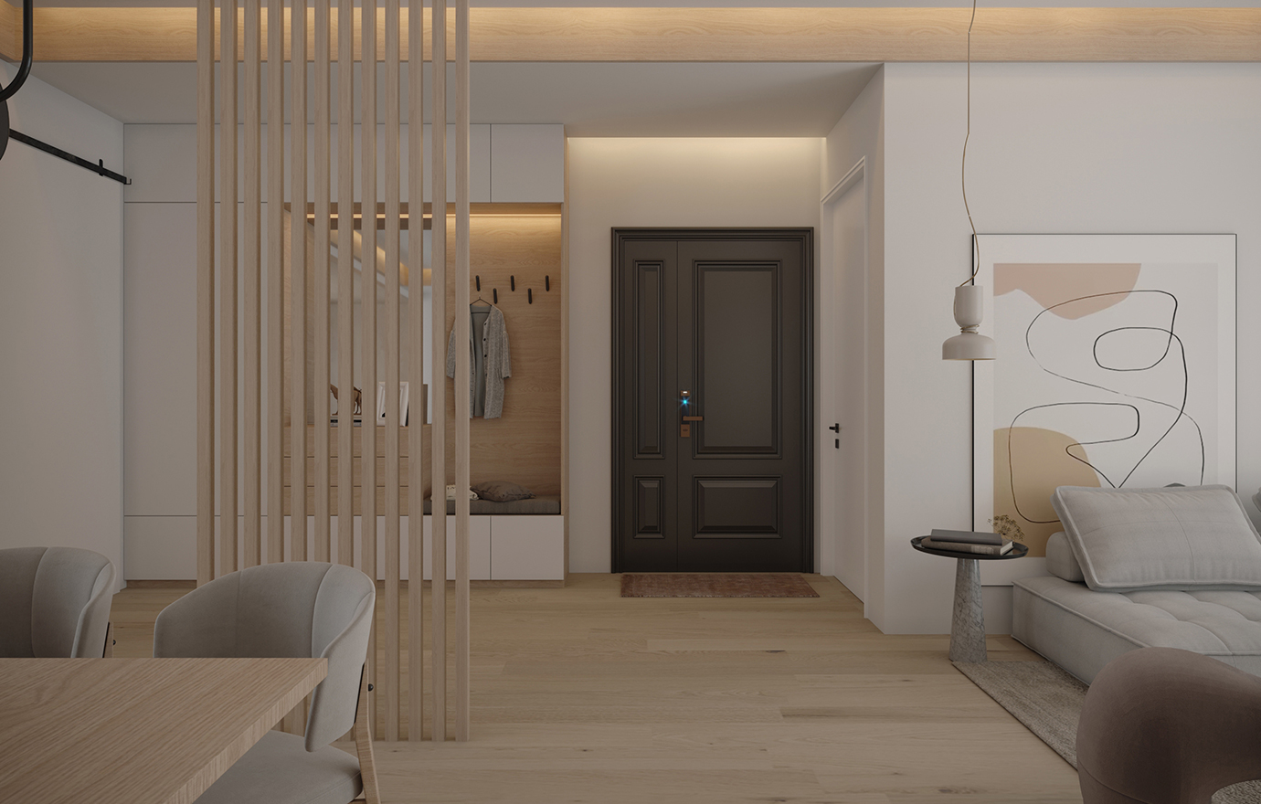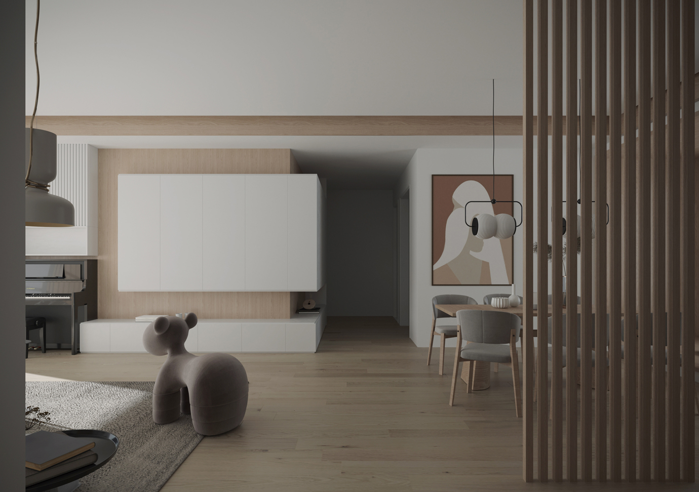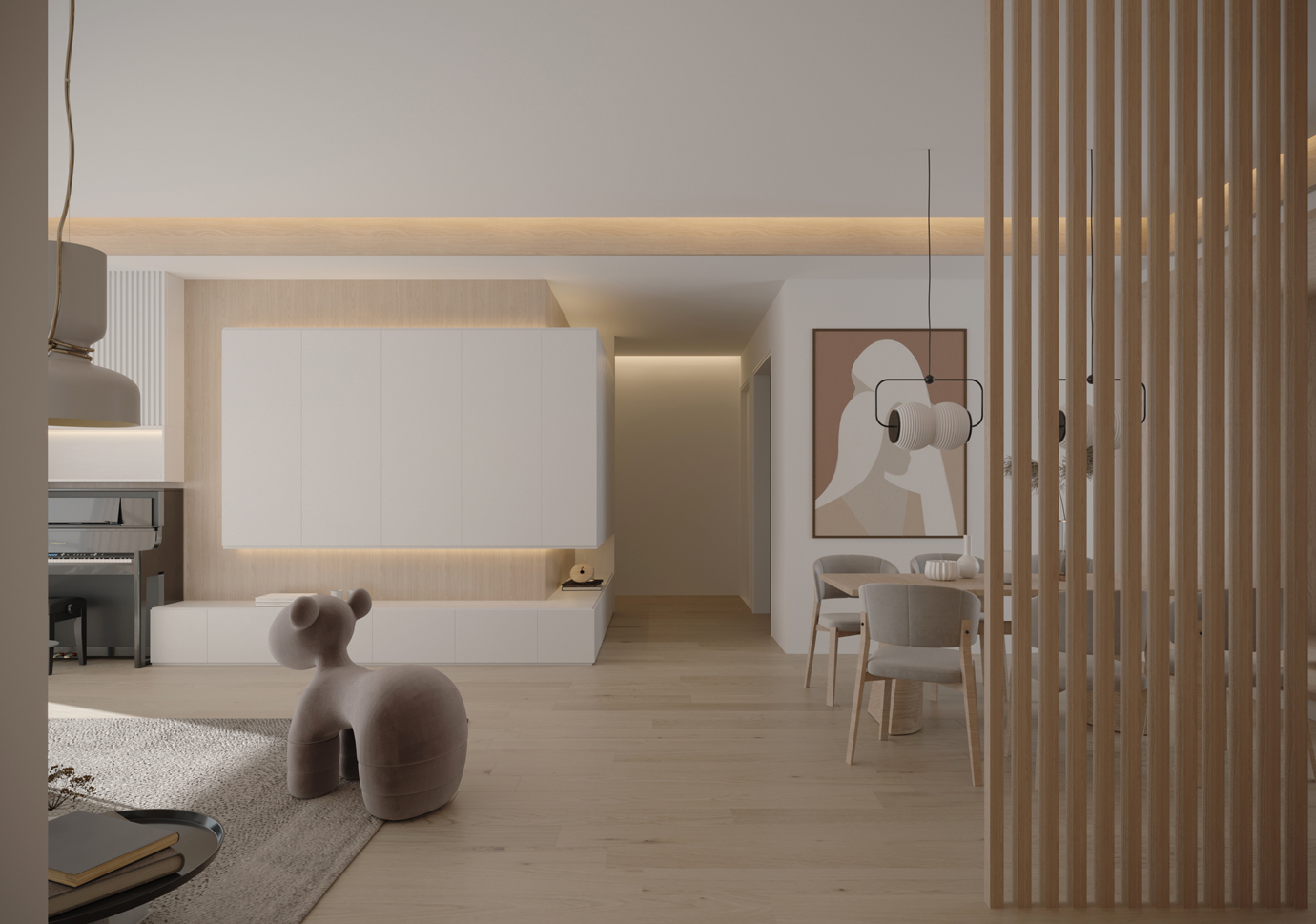 温润木色搭配白色墙体贯穿整个装修设计,入户玄关傍晚黄昏一开门那一抹温柔瞬间吹散了整天的工作疲劳,今日份的幸福感在心头环绕,慵懒却又轻快。原主卧房门的改动增加玄关区域的仪式感,餐厅区域的采光及舒适度都有了很大的提升。邻近天地壮阔,厚载心境盛境,格局是横亘于人群中幽静的分野。客厅电视背景的2:8的整体电视柜让居住收纳得到完美体现, 通过不同层次的木色搭配鸦青与灰色的沙发,小小的一撮绿植增添生机。整套空...
