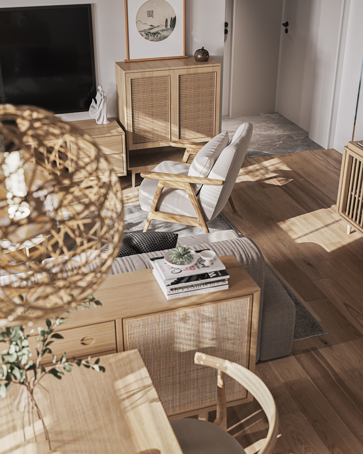 温润木色搭配白色墙体贯穿整个装修设计,入户玄关傍晚黄昏一开门那一抹温柔瞬间吹散了整天的工作疲劳,今日份的幸福感在心头环绕,慵懒却又轻快。原主卧房门的改动增加玄关区域的仪式感,餐厅区域的采光及舒适度都有了很大的提升。邻近天地壮阔,厚载心境盛境,格局是横亘于人群中幽静的分野。客厅电视背景的2:8的整体电视柜让居住收纳得到完美体现, 通过不同层次的木色搭配鸦青与灰色的沙发,小小的一撮绿植增添生机。整套空...