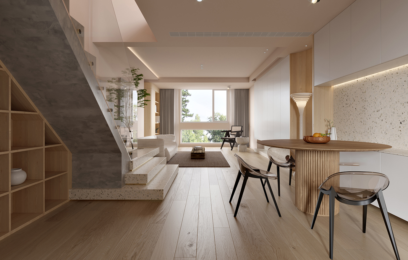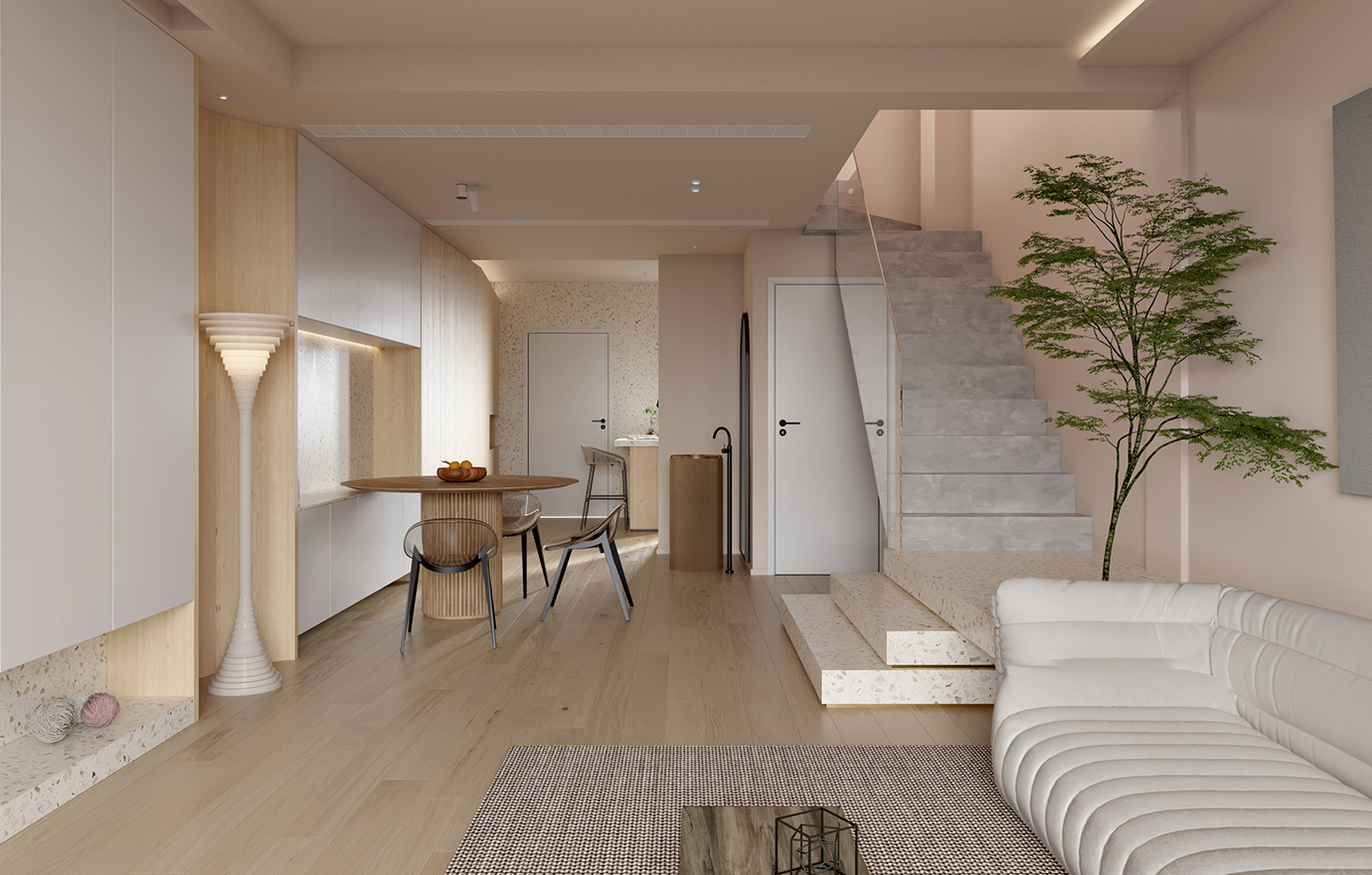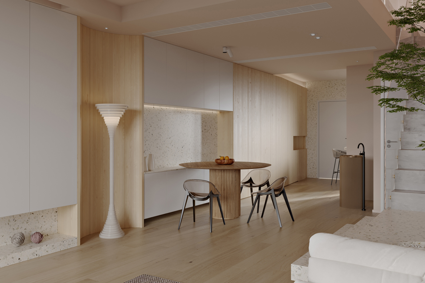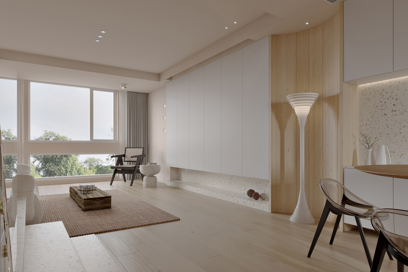 温润木色搭配白色墙体贯穿整个装修设计,入户玄关傍晚黄昏一开门那一抹温柔瞬间吹散了整天的工作疲劳,今日份的幸福感在心头环绕,慵懒却又轻快。原主卧房门的改动增加玄关区域的仪式感,餐厅区域的采光及舒适度都有了很大的提升。邻近天地壮阔,厚载心境盛境,格局是横亘于人群中幽静的分野。客厅电视背景的2:8的整体电视柜让居住收纳得到完美体现, 通过不同层次的木色搭配鸦青与灰色的沙发,小小的一撮绿植增添生机。整套空...