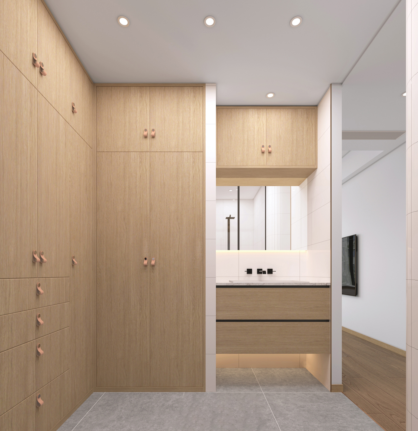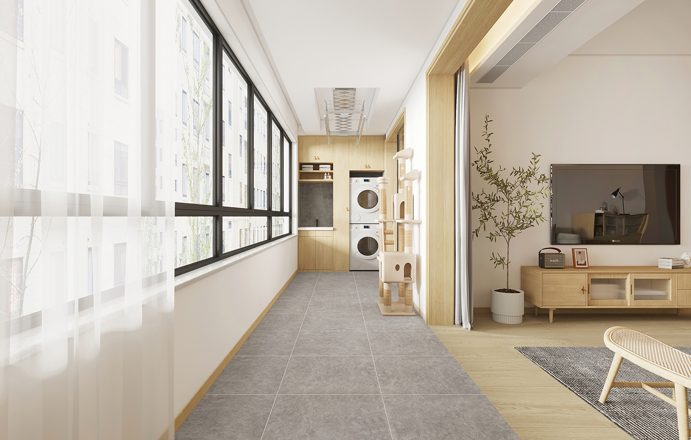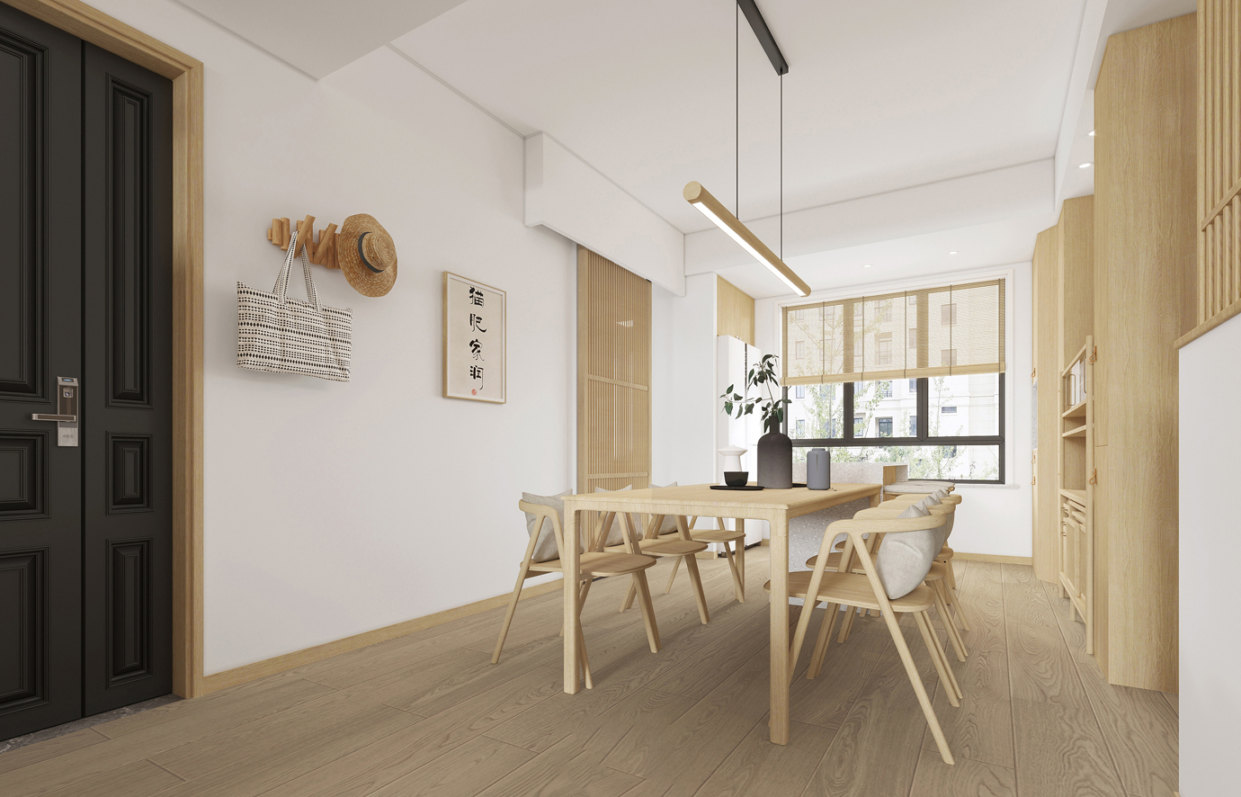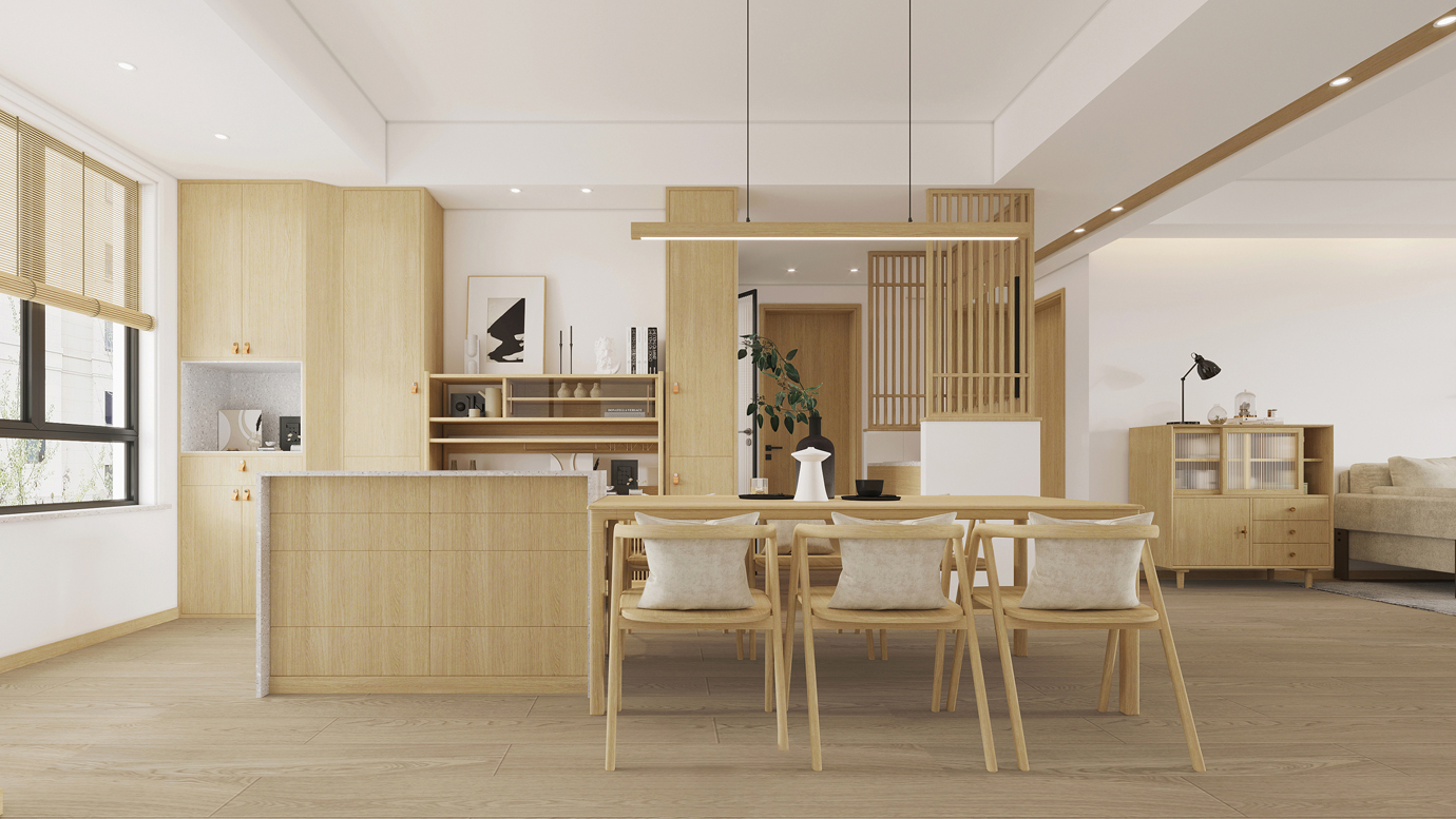 温润木色搭配白色墙体贯穿整个装修设计,入户玄关傍晚黄昏一开门那一抹温柔瞬间吹散了整天的工作疲劳,今日份的幸福感在心头环绕,慵懒却又轻快。原主卧房门的改动增加玄关区域的仪式感,餐厅区域的采光及舒适度都有了很大的提升。邻近天地壮阔,厚载心境盛境,格局是横亘于人群中幽静的分野。客厅电视背景的2:8的整体电视柜让居住收纳得到完美体现, 通过不同层次的木色搭配鸦青与灰色的沙发,小小的一撮绿植增添生机。整套空...