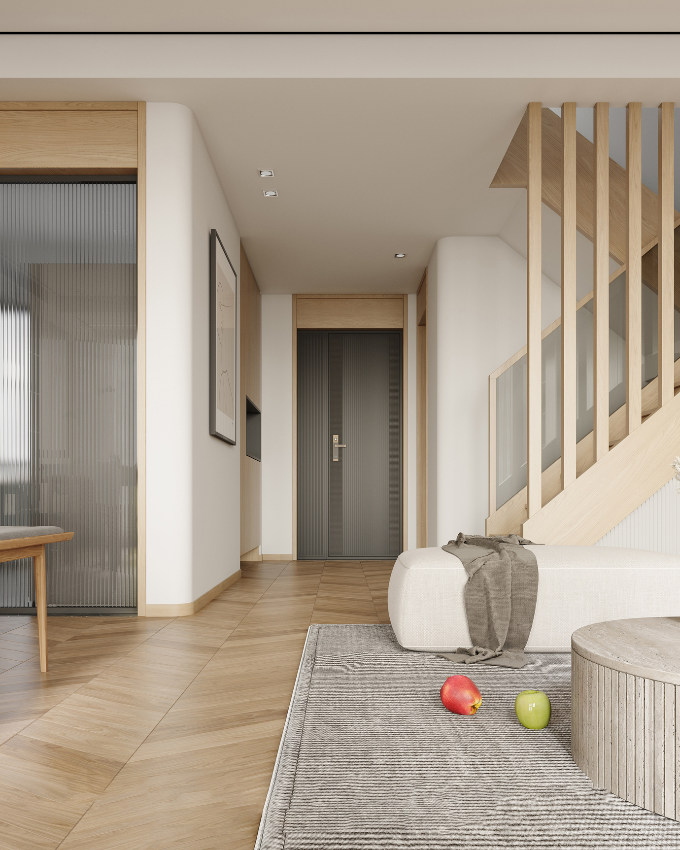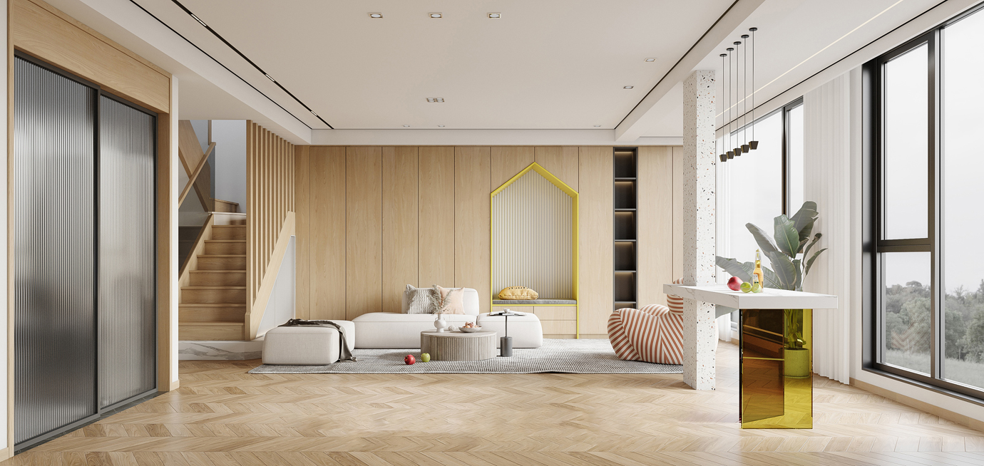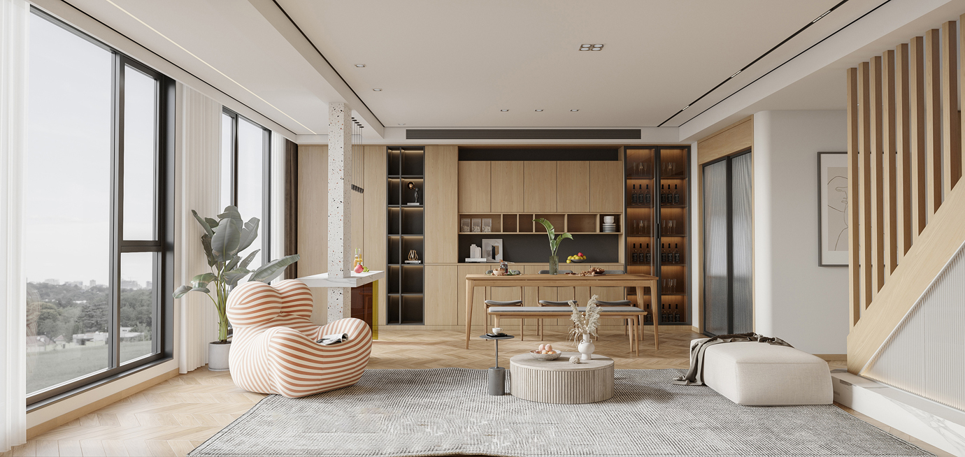 温润木色搭配白色墙体贯穿整个装修设计,入户玄关傍晚黄昏一开门那一抹温柔瞬间吹散了整天的工作疲劳,今日份的幸福感在心头环绕,慵懒却又轻快。原主卧房门的改动增加玄关区域的仪式感,餐厅区域的采光及舒适度都有了很大的提升。邻近天地壮阔,厚载心境盛境,格局是横亘于人群中幽静的分野。客厅电视背景的2:8的整体电视柜让居住收纳得到完美体现, 通过不同层次的木色搭配鸦青与灰色的沙发,小小的一撮绿植增添生机。整套空...