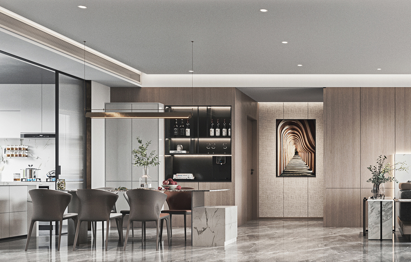 温润木色搭配白色墙体贯穿整个装修设计,入户玄关傍晚黄昏一开门那一抹温柔瞬间吹散了整天的工作疲劳,今日份的幸福感在心头环绕,慵懒却又轻快。原主卧房门的改动增加玄关区域的仪式感,餐厅区域的采光及舒适度都有了很大的提升。邻近天地壮阔,厚载心境盛境,格局是横亘于人群中幽静的分野。客厅电视背景的2:8的整体电视柜让居住收纳得到完美体现, 通过不同层次的木色搭配鸦青与灰色的沙发,小小的一撮绿植增添生机。整套空...