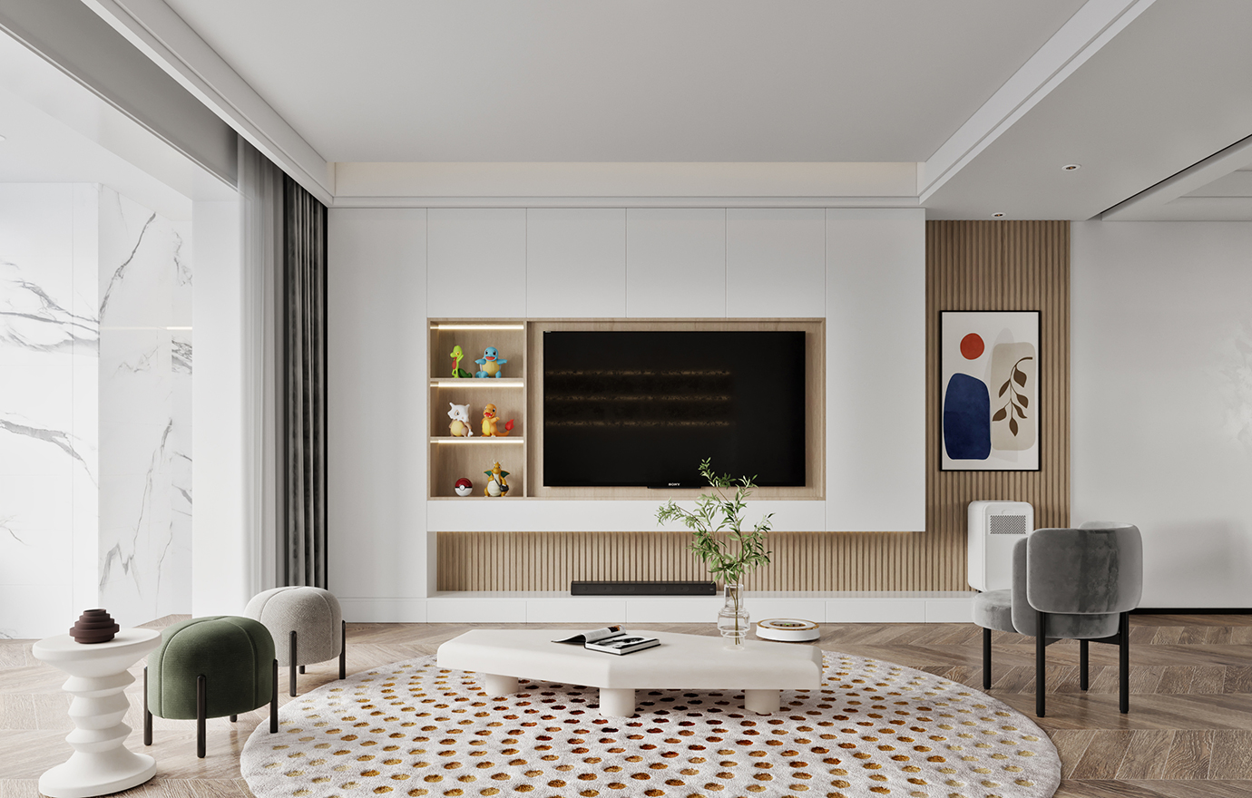 温润木色搭配白色墙体贯穿整个装修设计,入户玄关傍晚黄昏一开门那一抹温柔瞬间吹散了整天的工作疲劳,今日份的幸福感在心头环绕,慵懒却又轻快。原主卧房门的改动增加玄关区域的仪式感,餐厅区域的采光及舒适度都有了很大的提升。邻近天地壮阔,厚载心境盛境,格局是横亘于人群中幽静的分野。客厅电视背景的2:8的整体电视柜让居住收纳得到完美体现, 通过不同层次的木色搭配鸦青与灰色的沙发,小小的一撮绿植增添生机。整套空...